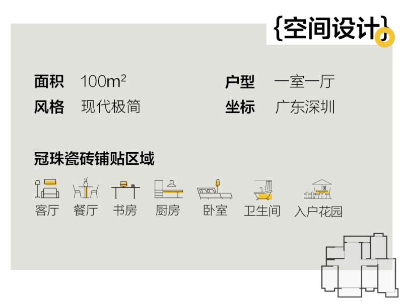 本期冠珠瓷砖美居设计,将结合屋主所需打造独特高级灰品质空间,呈现快节奏城市中慢生活舒适人居典范。将100㎡户型装修设计成集开放式厨房、通透客餐厅、恬静书房、温馨卧室,外加惬意小花园的品质一居室,用流畅与实用的空间布局,全方位展现忠于自我的生活态度。