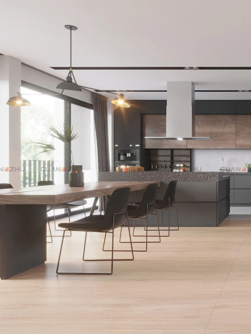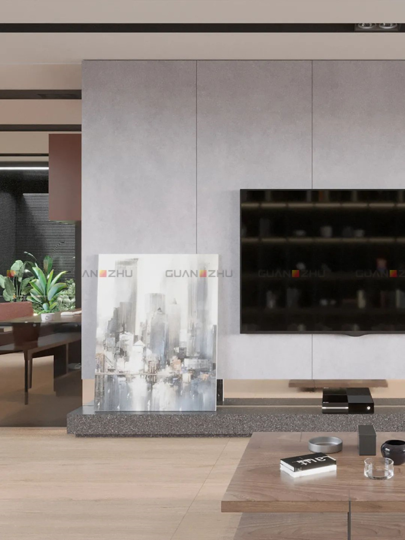 为打造更宽阔空间视野,客餐厅设计不做空间区隔,地面通铺原木岩板,大规格精密铺贴,空间延伸感瞬间放大。秉承着简约即是经典的原则,客厅电视背景墙也不做多余装饰,浅灰色水泥风岩板,原生质感一片到顶,再搭配深灰色软装,反倒让空间增添一份沉稳与自然。