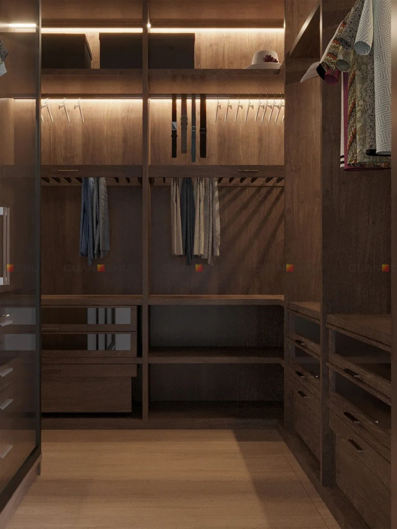 作为卧室里隐藏的“秘密武器”——嵌入式的衣帽间则瞬间让人倍感惊喜,温润木质感搭配全幅可视化玻璃门柜,防尘实用,低调奢华感让人忍不住感叹:谁不想要这样一个有颜又实用的大衣帽间呢?
