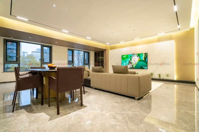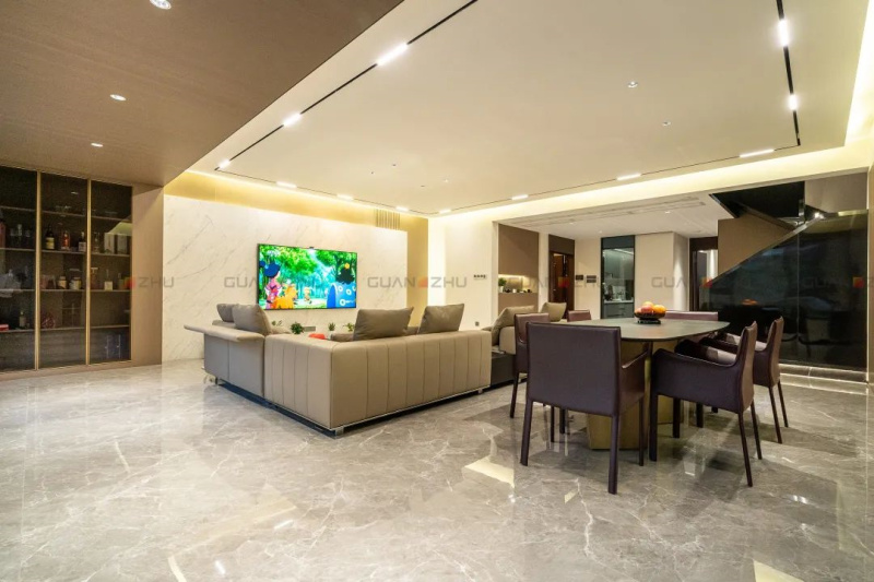 客餐厅作为居家生活中最主要的公共空间,承载了最多的生活场景设想,也是个人生活品质与审美的彰显。通透、明亮,客厅简洁的无主灯顶面加上冠珠摩卡灰亮面地砖,视觉上的宏大观感让整个空间显得雅致从容。