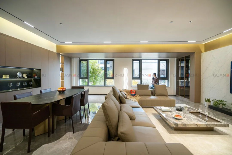 墙面窗的位置是经过精心规划的,既让外面的自然景观尽收眼底,也能让自然光足以照亮每一个角落。地面铺贴的冠珠摩卡灰瓷砖呈现出细腻的肌理,搭配自然光线,增加了空间的通透感。低矮靠背沙发家具以半围合的组合方式,强调谈话交流的亲密感与舒适感。这种公共区域开阔式设计,扩大了空间视觉面积效果的同时,也让整个空间保持美好、温情的家居气氛。