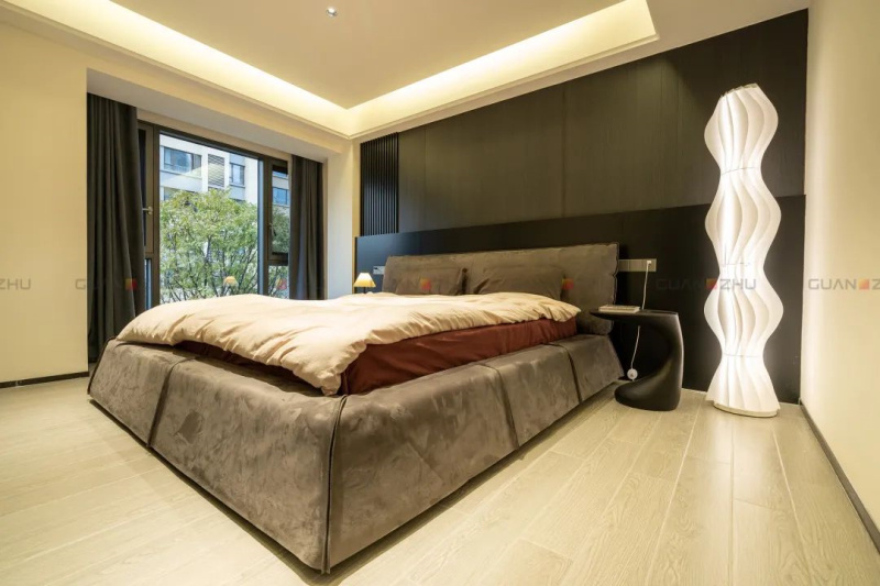 主卧简约内敛的色调,素雅中不乏低调轻奢,一门到顶深棕木质衣柜设计,旁搭配黑色玻璃梳妆台,每一处细节彰显了屋主张女士对居住私有空间低调极简的生活美学。