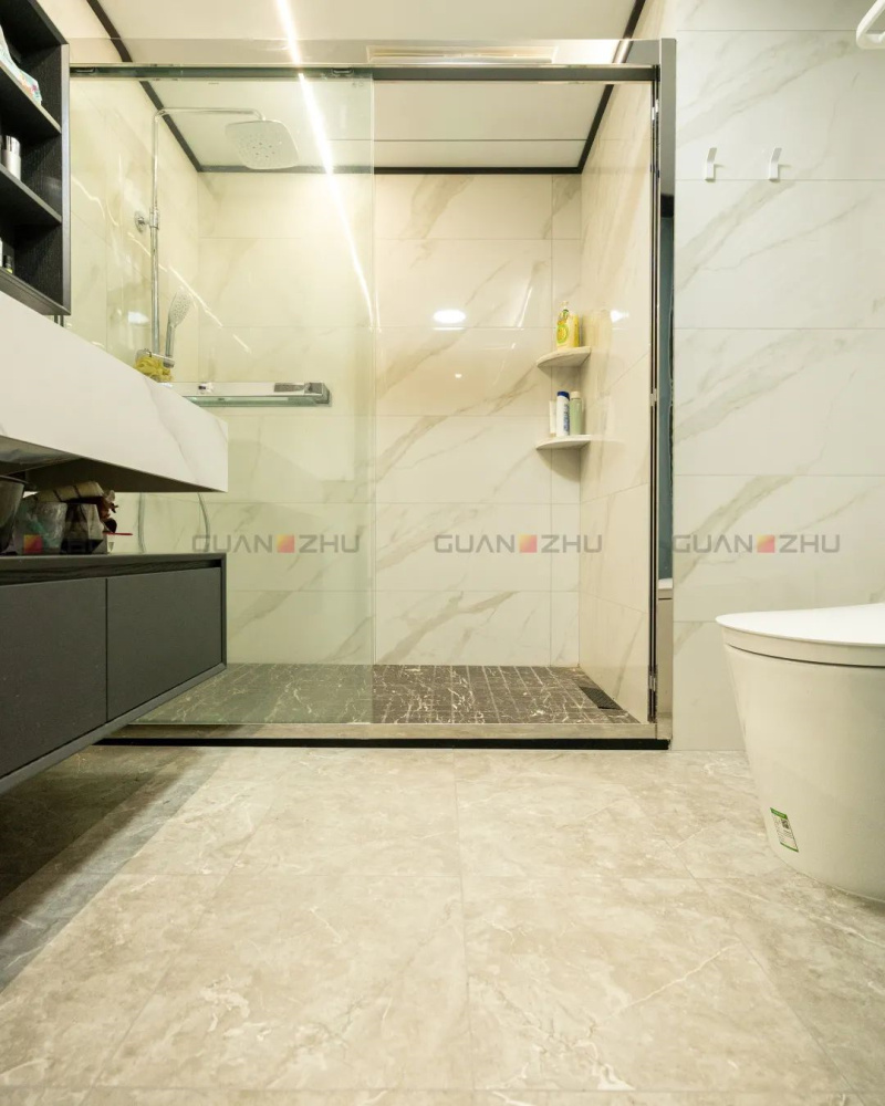 主卫墙面选用自带山水纹理感的冠珠鱼肚白瓷砖,地面则沿用了易于日常打理的冠珠摩卡灰瓷砖,上浅下深简单的色彩对比,使空间格局显得愈加纯粹与强烈。