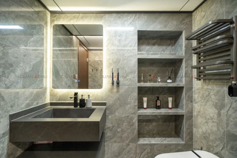 次卫墙地通铺冠珠柏林灰瓷砖,让视觉上的统一感更强,看起来更为平衡。右侧利用墙体厚度打造一组储物柜,提高了空间利用率。和自己独处的随性舒适的氛围,卸下工作的负担与疲惫,自在松弛,在这样的新家中,享受平静的个人时光,同时也能兼顾和家人同处一室的需求,这是屋主张女士所期盼的新居生活。