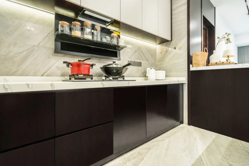 为了保持色调和谐性,厨房墙面选用了冠珠紫金沙,柔美的色调搭配流沙点缀,不经意间将自然气息融入生活。多种光源组合,为空间注入轻盈明亮的氛围感。