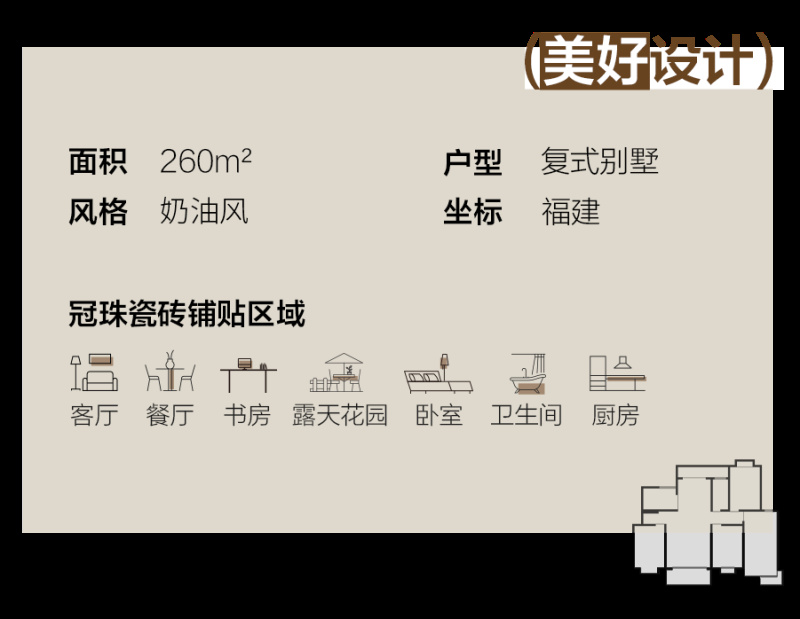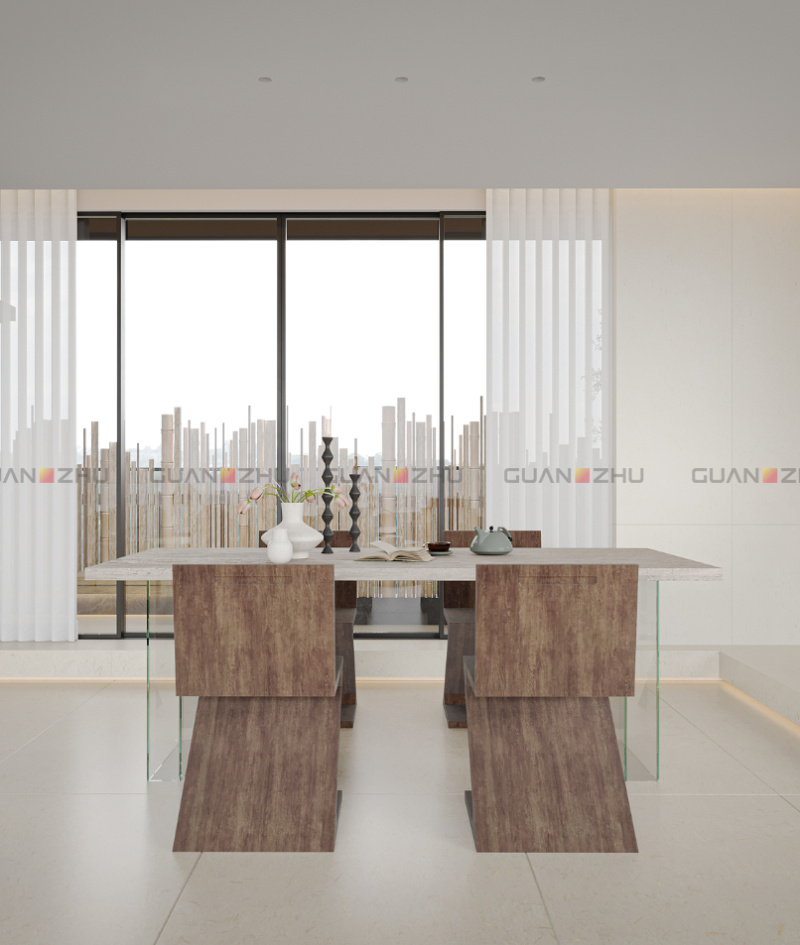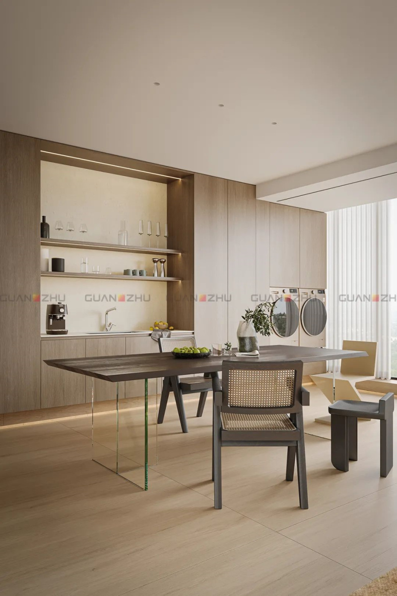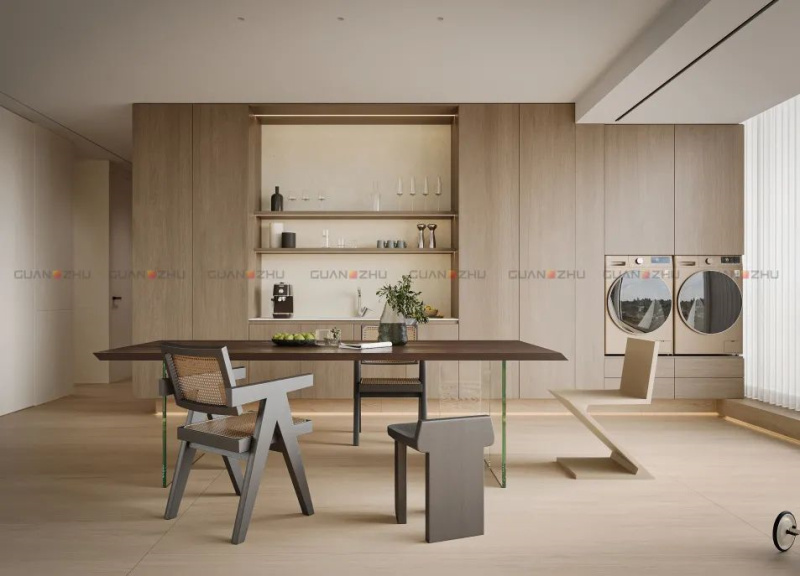 为将小说家的细腻与浪漫更好的融入设计,全屋以冠珠华脉「漫步巴蜀」系列产品笺纸米黄为基础色系,将传统奶油风向质感与亲近方向延伸打造,用亲近感十足的栗黄木色通铺起居空间地面,配合木质桌椅与米白沙发软装,整体空间瞬间被笼上一层奶fufu的温馨感。