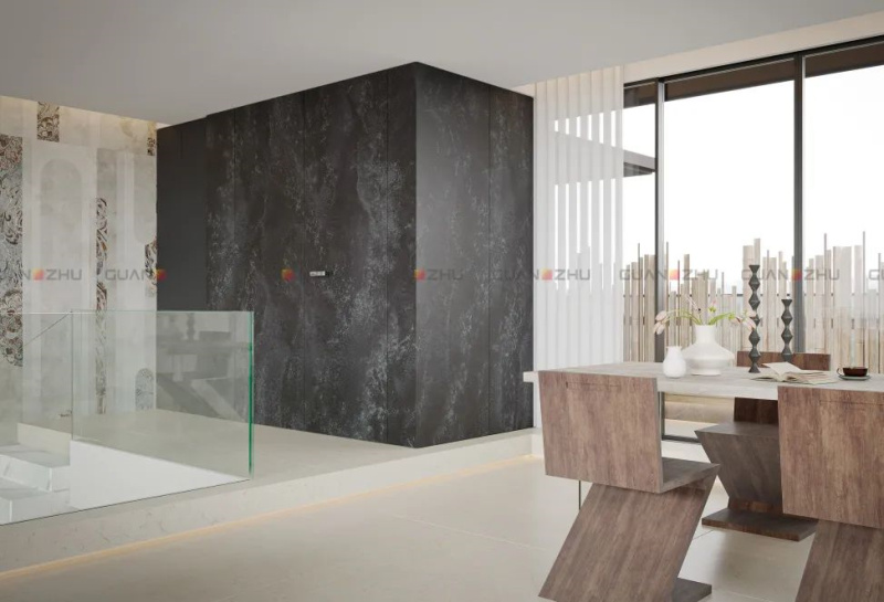 再结合不同空间生活所需做细分装饰,餐厅一角点缀玄晖龙纹岩板,强化餐桌仪式感,厨房岛台选择深灰岩板定制铺贴,耐脏防刮;而在楼梯处则选用艺术气息浓重的敦煌画壁纹理岩板铺贴墙面,巨幅墙面,贯穿上下两层,空间质感瞬间拉满。