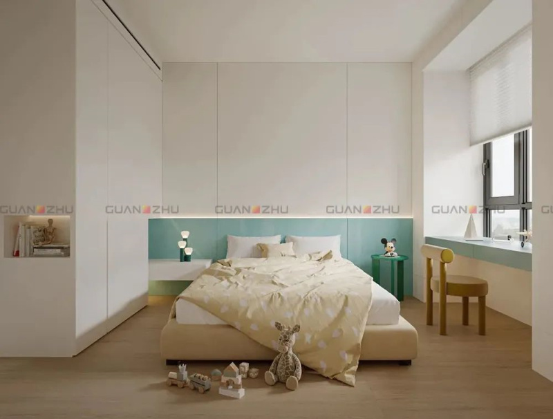 对比公共区域的质感装点,卧室则更加凸显亲近与舒适,主卧选用瑞银龙纹岩板做床头墙面装饰;两个儿童房则用霜影灰、素绢白以及矿石绿增加儿童房清新自然感,丝丝绢帛纹理,柔和如斯,细致呵护每个成长瞬间。