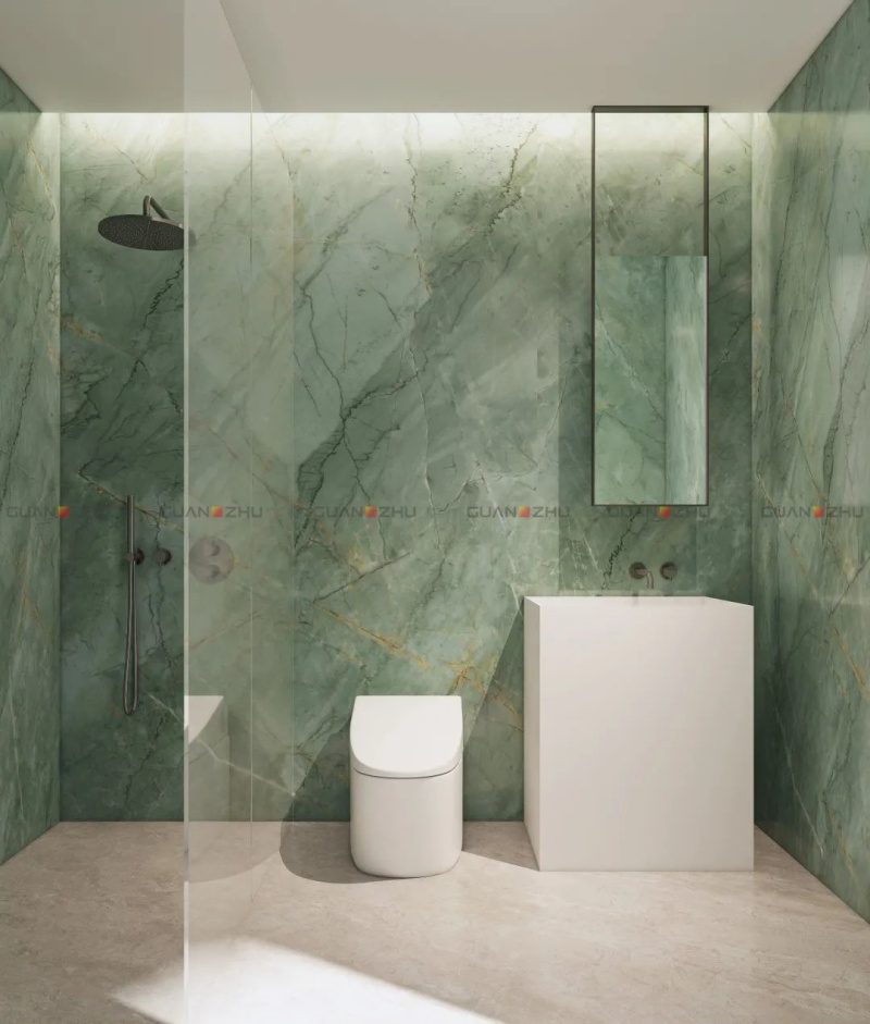 用色彩打开视觉感官的享受方式,卫浴空间采用了有绿宝石般质感的冠珠华珍「碧波绿」岩板,大面积的翠绿色调,宛如清明澄澈的绿色之水,充分贴合卫浴空间的特质,打造精致艺术的生活体验。 区别于传统饰材,冠珠华珍「碧波绿」岩板具备防潮、防滑、耐磨等特性,是现代家居打造高颜值卫浴空间的优质选择。