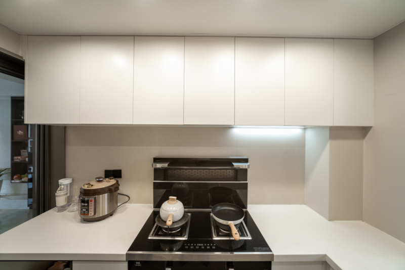 厨房空间有限,采用的是功能性U型布局,一字型置物收纳柜,让空间利用率得以最大化。整个空间选用隐藏式无拉手的米白色系柜体,搭配冠珠星悦石-象牙白亮光釉面随意层叠的裂纹,纵横交错的线条纹理,在无主灯的衬托下,诠释着素色空间的质感奥义,带来视觉上无限的拉伸感,给为家人下厨的妈妈带来更舒爽的空间体验。