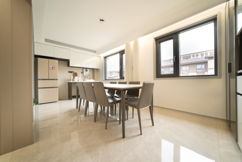 承载着一餐一饭的日常生活,记录着家的情感记忆,屋主陈女士选择打造一个独立的用餐空间,享受一家人相聚的温暖。餐厅区域继续沿用灰、白配色,打造和谐统一的空间色调,简约的餐桌椅,打破无趣与严肃,释放极简的造型张力与艺术气场。