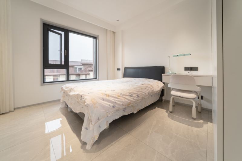 将极简的形态延伸至主卧空间,无须过多的装饰,更多是讲究实用优雅的居住体验。每一个卧室都选用冠珠劳伦白金瓷砖,搭配不同层次的浅灰系软装,低饱和的灰调营造舒缓平和的睡眠环境,木质小床增添温暖气息,让整个空间变得舒适而温馨。