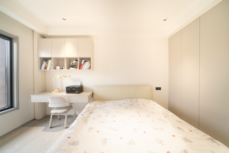 孩子们的卧室同样沿用极简风格,保留足够的空间,为成长预留更多的可能。一门到顶的衣柜收纳性强,与同为浅灰色系的学习书桌带来和谐统一的空间视觉,隐形把手的设计简洁大气,诠释质感家居的优雅格调。