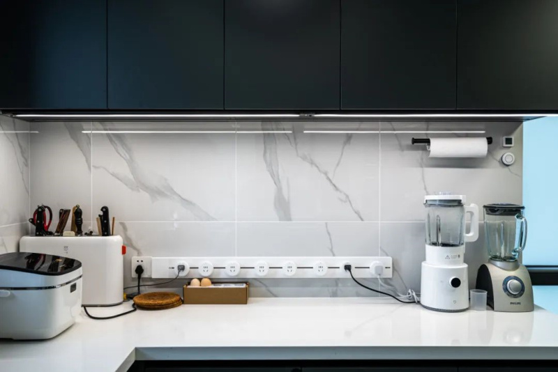 利用好每一个多余空间,让生活去填满它。转角的空置处被屋主廖先生布置成简易洗衣房,将冠珠象牙白通铺上墙,既能避免潮湿水汽,又能打造视觉延伸效果,维持空间完整性,显得美观又实用。