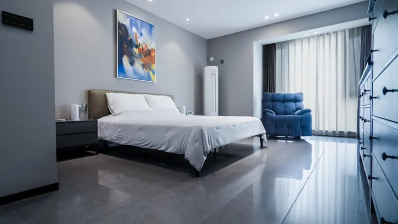 两间卧室都选用冠珠萨丁灰岩进行地面通铺,浅灰的地面与灰系的墙面相互映衬,带来了颇具层次的空间质感。搭配简约的软装收纳、艺术抽象的挂画,让整个空间更显灵动。