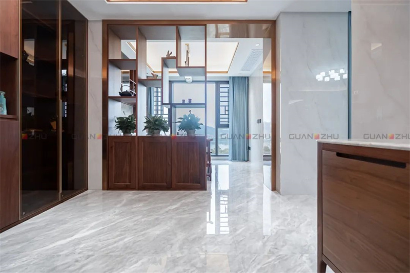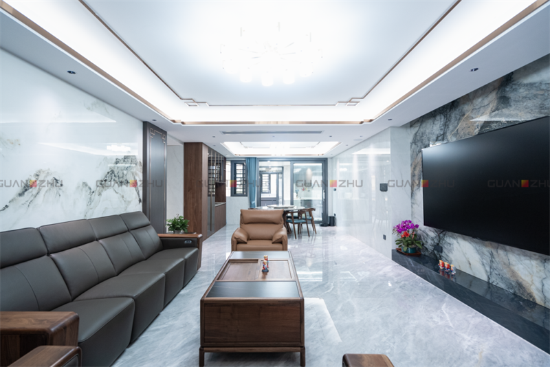 将禅意的思想运用到中间中去,新中式风格与屋主郑先生奉行的中庸之道颇有相通之处——追求稳定、和谐,在新家的设计中,随处可见对称式设计,只为构建稳重端庄的空间感。如客厅沙发的背景墙,选用的是左右连纹的冠珠千里江山岩板,两侧加入冠珠檀香-墨色岩板,宛如一幅装裱好的泼墨山水画卷徐徐展开,颇有一种返璞归真的意味。