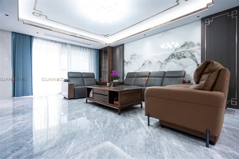▲沙发背景墙居中应用产品:冠珠千里江山岩板