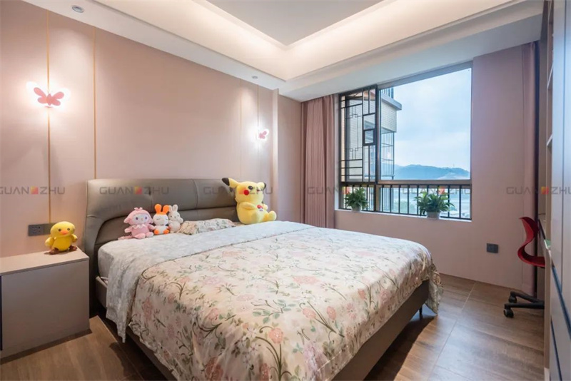 粉色的甜蜜浪漫与法国橡木的优雅气质相辅相成,女儿房用粉红色作为色彩基调,墙面用的是冠珠墙纸-樱粉岩板,可爱跳跃的点格纹理搭配粉嫩的樱花色,不论是大面积整装还是小范围点缀,都能将少女感拉满,打造出一个温暖而柔软的空间。
