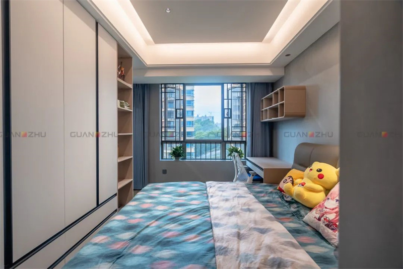 另一间儿子的房间则以稳重为主,柜体嵌入墙面,保留了更多的收纳空间。床头背景墙选用冠珠华脉系列的霜影灰岩板及矿石绿岩板,亮光墨水的点缀让肌理丝丝入扣。灰绿撞色的巧妙搭配,让空间显得沉稳而不沉闷。正如新中式运用传统美学与现代工艺,演绎空间美学。冠珠华脉系列产品融合了自然、文化、艺术之美,将设计灵感与中国特色融合,更加契合当下人居空间对时尚潮流的审美需求。