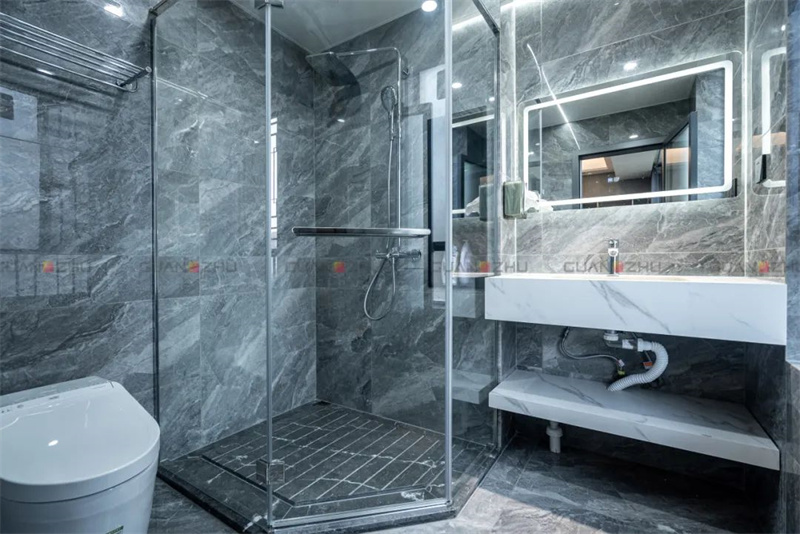 卫生间的设计同样以简约为准则,干湿分离的设计有效阻止水气蔓延,透明玻璃淋浴房保持了整体空间的通透感,墙地统一用冠珠喜马拉雅灰进行墙地通铺,自然石纹的肌理深浅交错自然衔接,打造一体的视觉感受,更显大气。