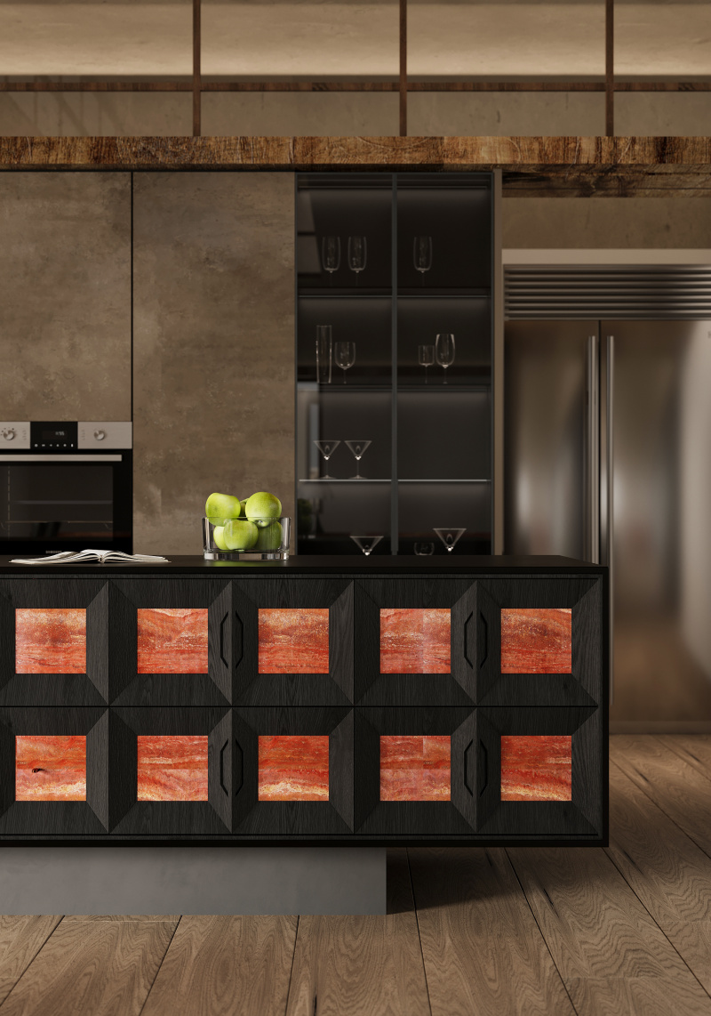 在这些明星案例中,显著的特点是王帅颠覆性地对传统美学展开了新应用。他从概念到落地,都巧妙地借助色彩实现空间的创新生长。在王帅看来,近些年国潮文化的大热和兴起,本质上是一种审美回归,并非突然而来。在这几个明星案例的设计中,他大量的采用冠珠「华珍」岩板,便是被「大美东方 国色造境」这样的理念以及“国色臻石 大宅之选”的特色所打动。