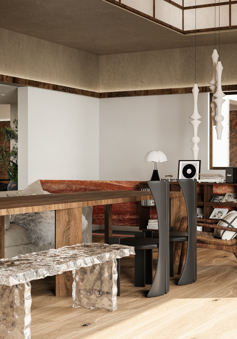 在演员张桐老师的家中,中国传统文化之美则展现得淋漓尽致。王帅表示:「张桐老师本身便是一个非常喜欢历史、具有文化深度的一个艺人。他需要我们家出现的东西都具有很强的文化性,尤其是中国的传统文化,这也是我们选择这些产品(冠珠华珍、华脉岩板)的原因。」在提出设计需求时,张桐老师表示希望家里在装修过后能有一种「居住过的痕迹」,不必刻意崭新,而要有更接近于天然而形成的感觉。