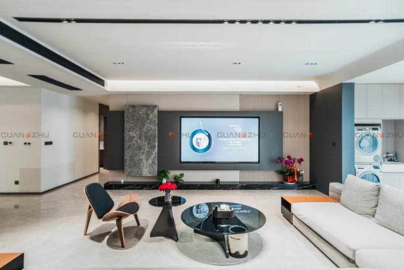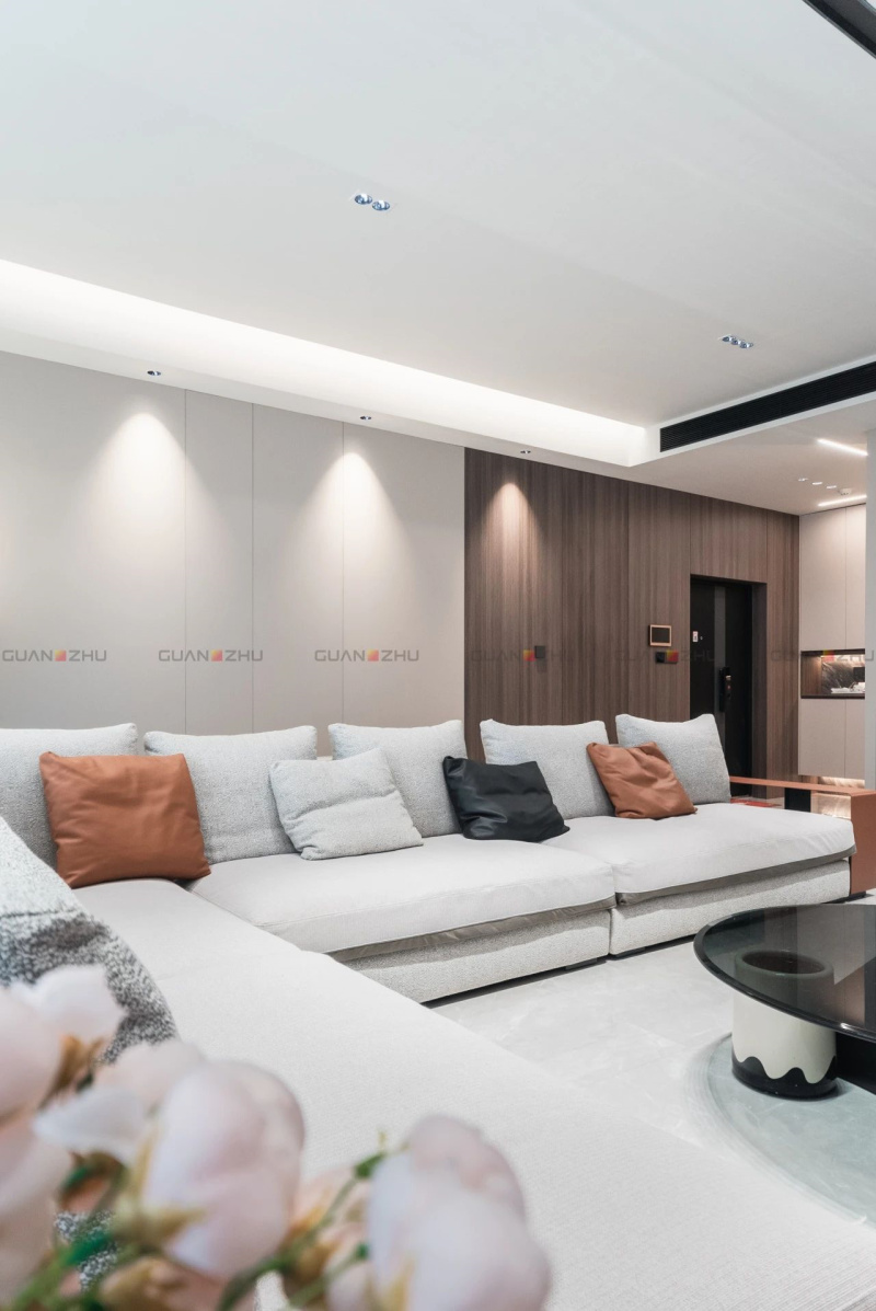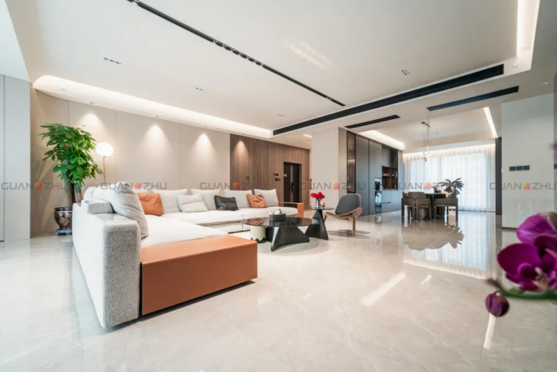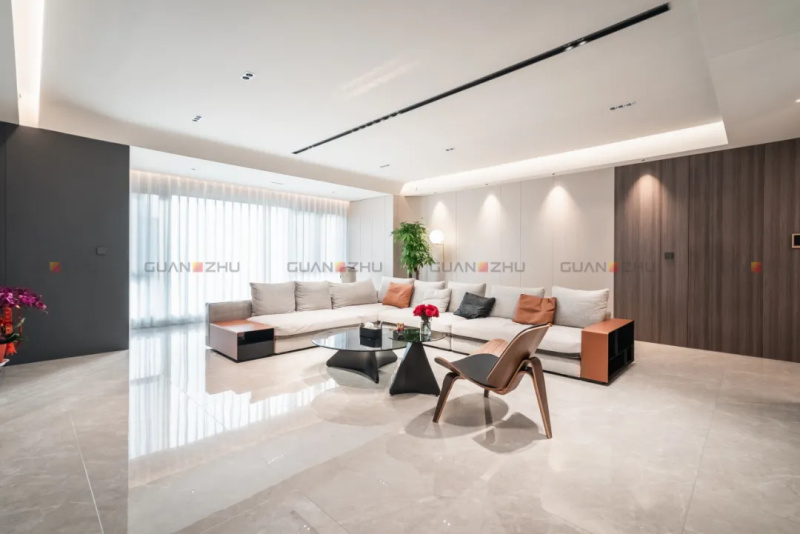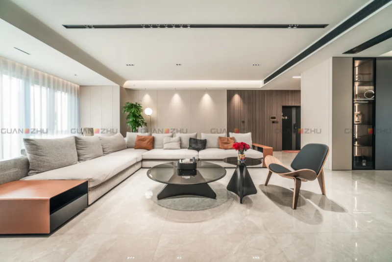 米色、暖灰作为基础色,舒适而高级黑色线条巧妙融入墙面、天花板和软装,引导视线流动。