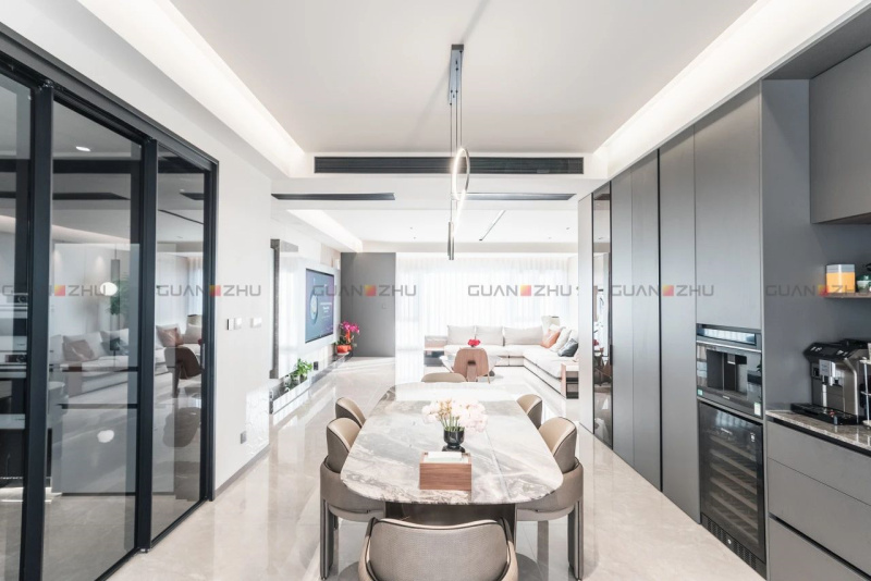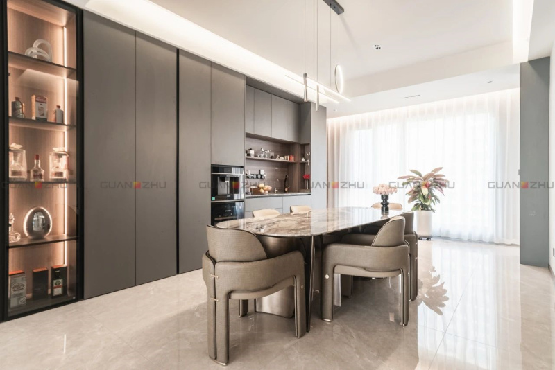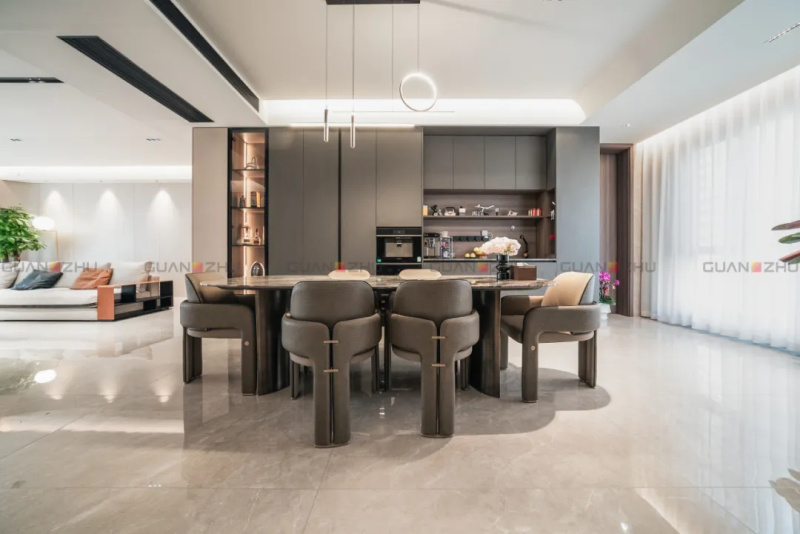 290㎡的大平层,单客餐厅区域就占据近100㎡,布局连贯,酒店大厅般的豪奢感扑面而来。地面通铺无限连纹、色调统一的冠珠普佩斯灰,还原顶级大理石天然纹理的自然美,暖灰色纹理延伸出视觉的张力,高级的质感为空间加分不少。