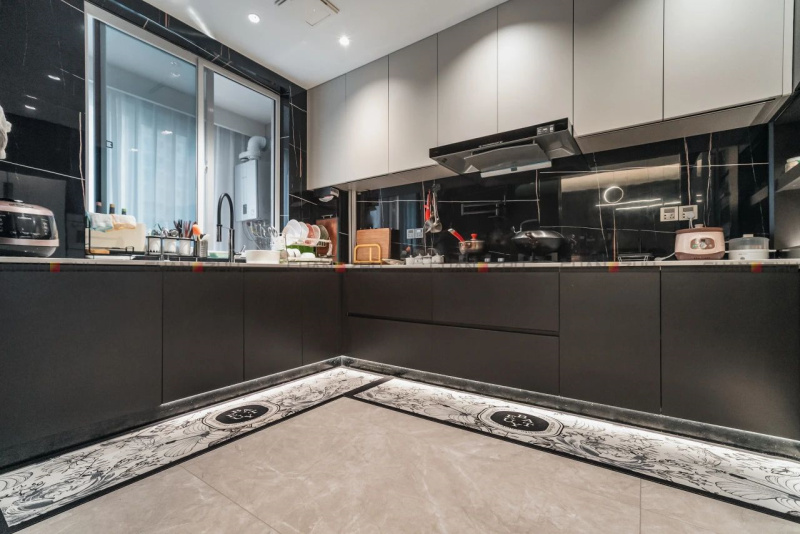 装修前,春女士做了整整20页的PPT,详细罗列出家人的生活需求。因为经常会邀请朋友来做客,一张足够大的餐桌就必不可少,沿墙面打造一整面黑色餐边柜。地面的冠珠普佩斯灰以极强的包容性,平衡了黑色带来的强烈视觉冲击,不会过于沉闷,也不会过于张扬。在不同区域使用不同颜色,白色顶柜,视觉上提升空间高度,灰色地面,耐脏且易于清洁。由上至下的色彩渐变,经典耐看且个性十足。