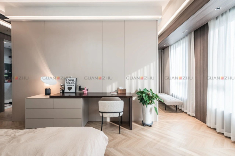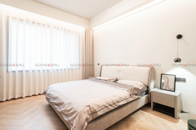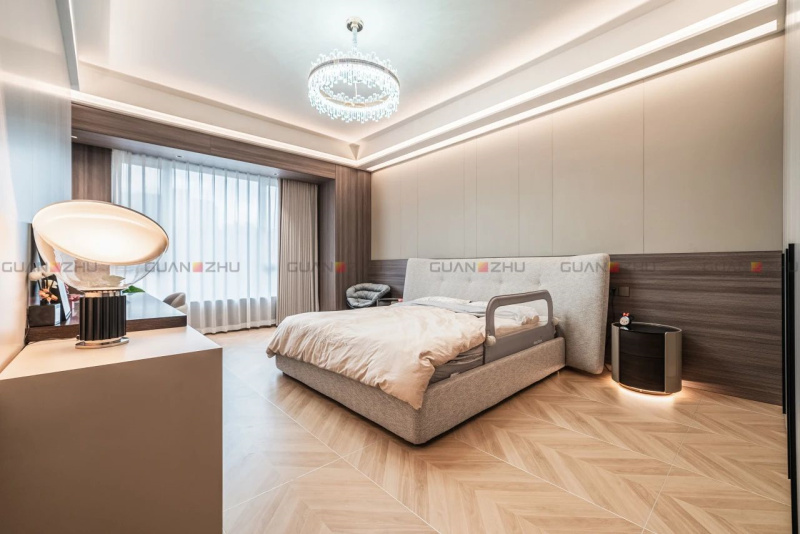 春女士旅游时喜欢观察各式各样的酒店设计,家中很多设计灵感都来源于此,在有限的空间中,极限放大居住体验感。卧室分布在客厅两端,实现动静分离,有效平衡家庭成员之间的个人空间和共享空间。每间卧室的风格、配套一致,见光不见灯的照明设计,舒适的温控系统、优质的隔音效果,打造出既统一又高标准的休息环境。