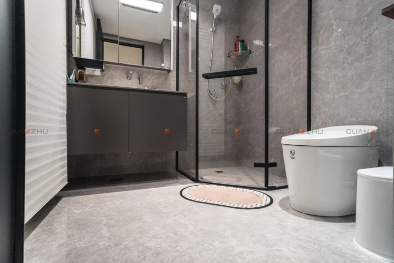 主卧参照套房设计,卧室+衣帽间+卫浴俱全,高标准中融入个性化功能区分。而隐藏在客厅的另一端的,则是春女士专门为先生打造的电竞房。房门关闭时看起来就是一面完整的墙,难以察觉,保证公共区域的美观性和整体感,也增强了隐私性。通过多元空间利用,房间具有更高的使用价值,既适合电竞又适合办公,还兼具客卧功能。即使先生游戏休闲、处理工作、应酬晚归,也不会影响其他家庭成员休息。新房的所有卧室均配套卫生间,满足洗浴、更衣等多种需求。采用干湿分离的功能组合设计,客卫的墙地沿用冠珠托德拉浅灰,浅灰的沉稳与黑色柜面的深邃相结合,让高级空间氛围感直线上升。