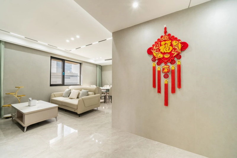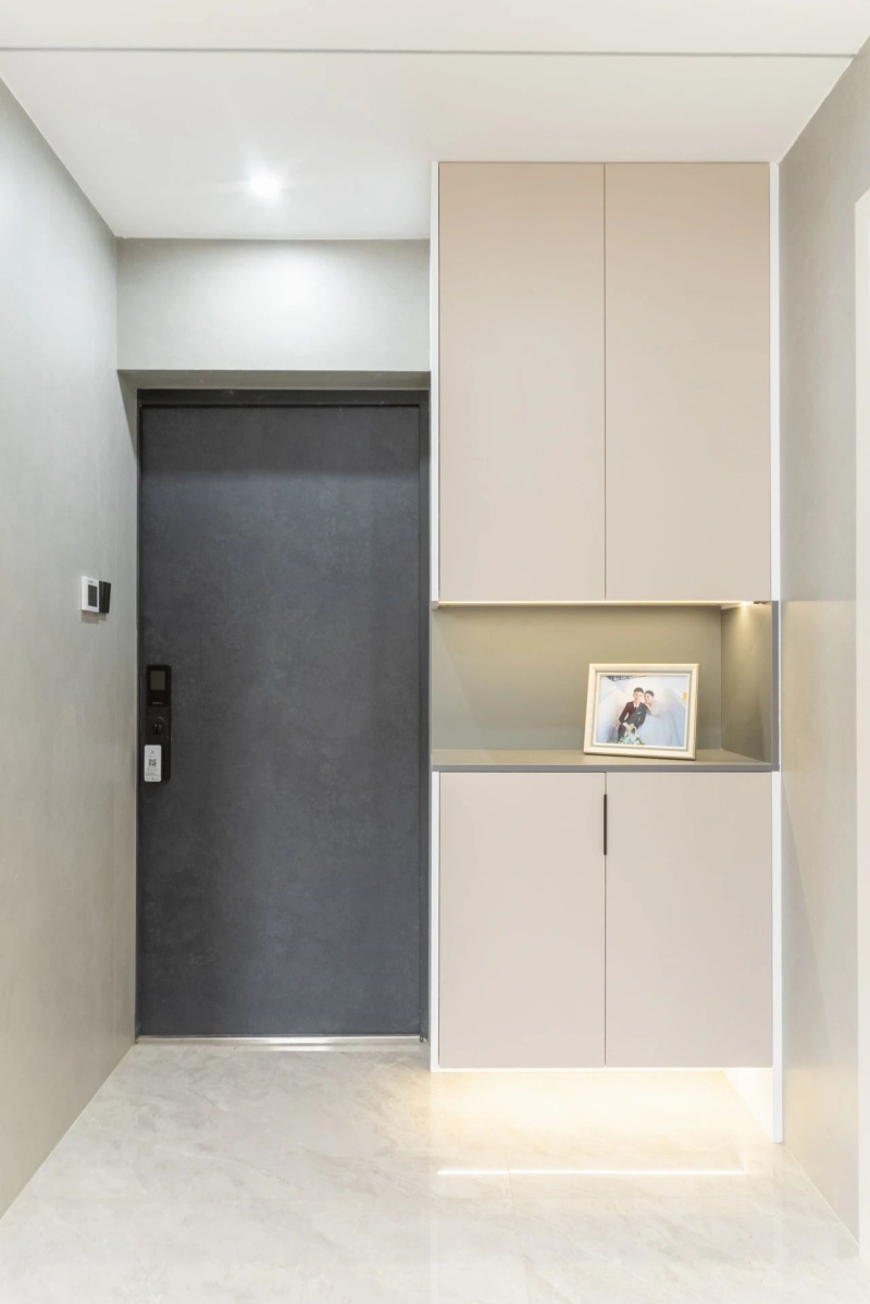 进门的玄关处被屋内的新婚喜气包裹着,让人一走进来就有了同喜同乐的幸福感。门口右手边预留了大面瓷砖墙打造简约氛围,新挂上的红彤彤的福字挂饰为空间添上一抹喜意。左手边则放置玄关置物柜,简约干净的置物柜上,摆放着的是屋主小夫妻的结婚艺术照,承载着新婚生活的美好期望及愉悦心情。