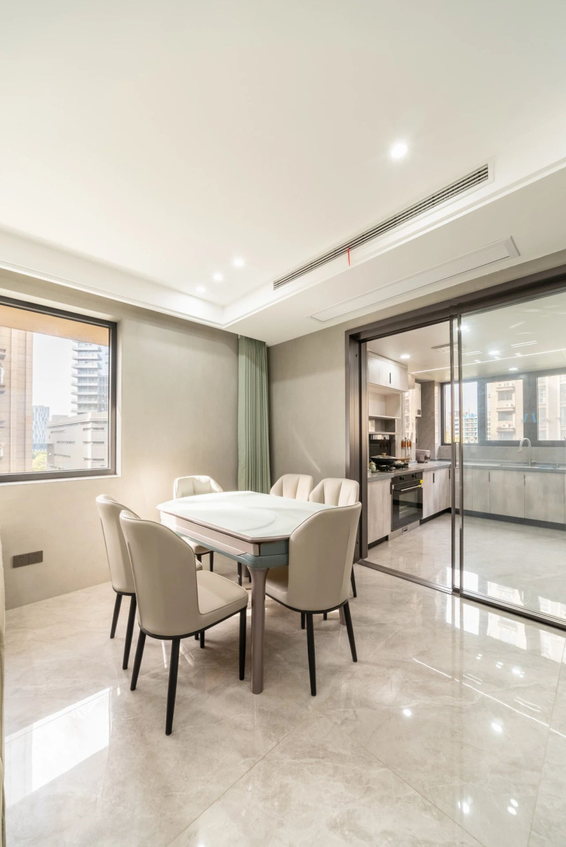 全屋以白色、米色系为主,2600×800mm超大规格冠珠格拉斯-浅灰岩板一片到顶,哑光墙砖搭配金色细框摆架点缀空间,增加色彩活跃度,让空间更加灵动。客餐厅地面通铺冠珠卡瑟灰亮面岩板,沉稳时尚,搭配皮质沙发,将“家”柔软的情绪力瞬间拉满,身处其中,让人格外放松。
