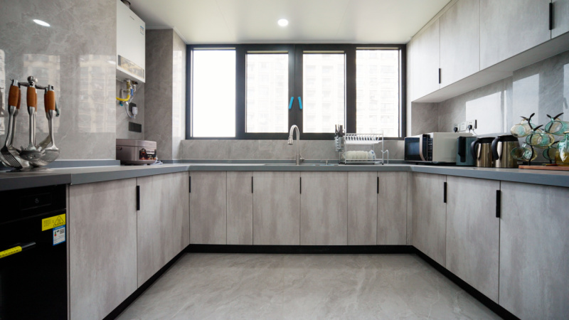 厨房选择了客厅同款瓷砖产品做设计延伸,冠珠卡瑟灰亮面的质地,让日常卫生清洁更简单省心。当沉稳的卡瑟灰撞上了高级黑,无疑是为浅灰色系空间增加一抹重色,显得内涵稳重而不古板。与墙砖同色系的门柜造型简约利落,不仅给视觉带来舒适的感受,更是生动诠释当代厨房极简美学。