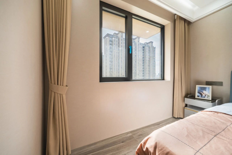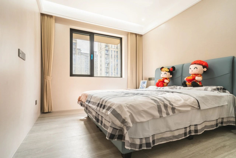 除了使用环保易打理的木纹砖铺贴,主卧室的墙面选择仿布纹的冠珠米兰布纹-米灰岩板,平顺柔和的纹理,于温和色感中带给人一种细腻与温和的感觉。同色系的窗帘及一门到顶的嵌入式衣柜,让卧室的整体视觉感更纯粹。