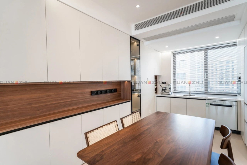 砸掉墙壁,开拓出更多空间,同时利用小面积的墙面做隔断。既打破固有格局,又让居室环境富于变化。拆除横跨在封闭式餐厨区中间的墙壁,把餐厅与厨房联结起来。不仅让空间更加开阔通透,也带来了更多的家庭互动体验。同样的面积,却拥有了不一样的幸福感。