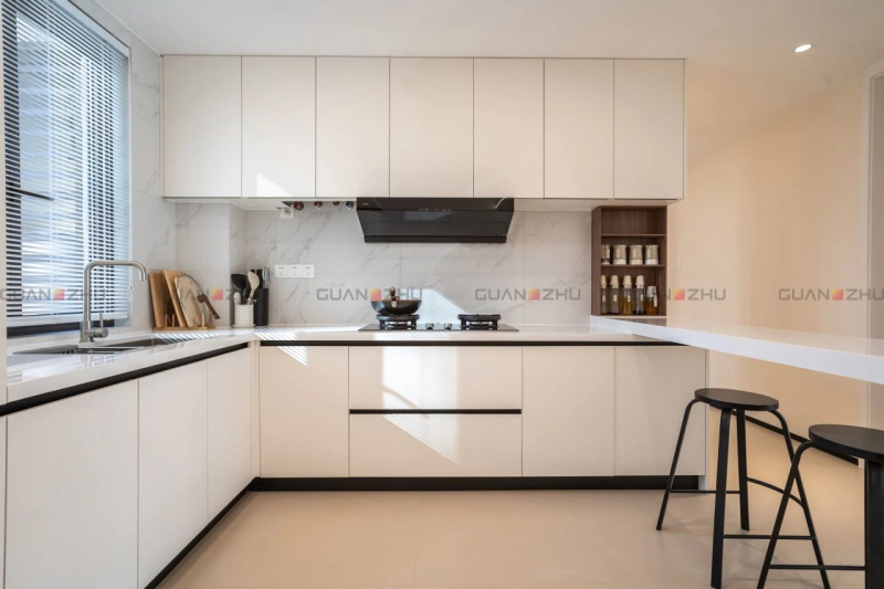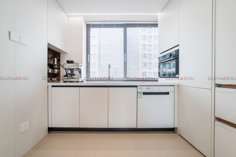 厨房里,L型布局与敞阔台面强强联合,轻松满足三餐四季的烟火日常。线条利落的白色柜体气质简约,搭配冠珠哑面砖,方便清理又颇具设计美感,镂空岛台满足备菜、日常饮食等多功能,自带一番小资情调。