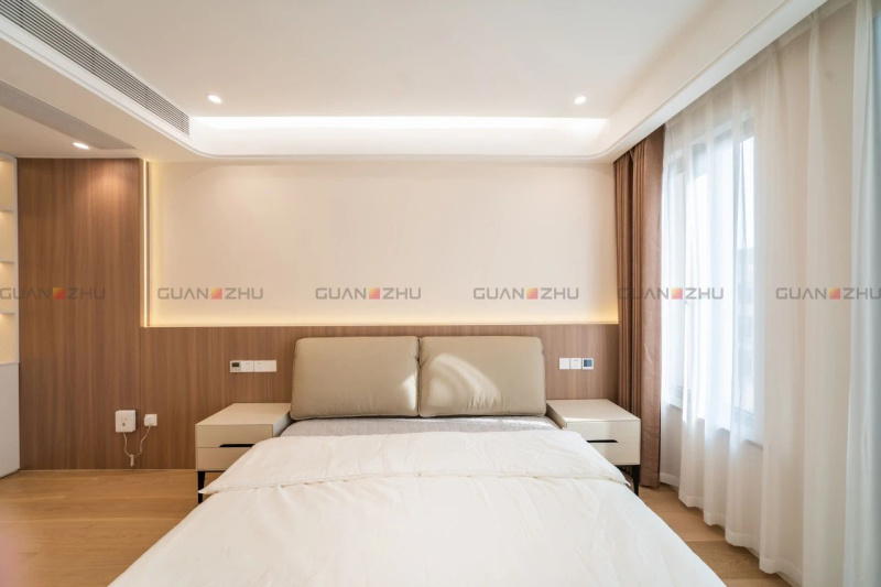 想要一个身心合一舒适的家,卧室也是重点改造区域。木纹肌理打底,让原木色浸染空间每个角落,搭配黑色或浅灰色的床品。不同色系的相互制衡,确保空间既有视觉冲击力,又不失温馨和谐。