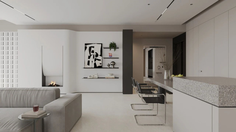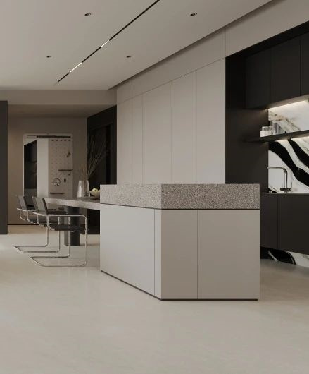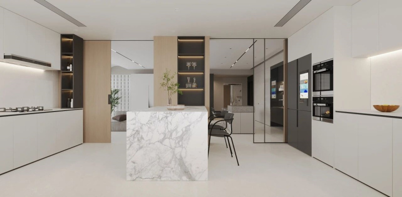 餐边柜+中岛台餐桌一体化设计,增加其功能性与形式感。其中,餐边柜柔和配色点缀以冠珠岩板2700×1200mm熊猫白独特纹理,为空间增添了不少灵动感。