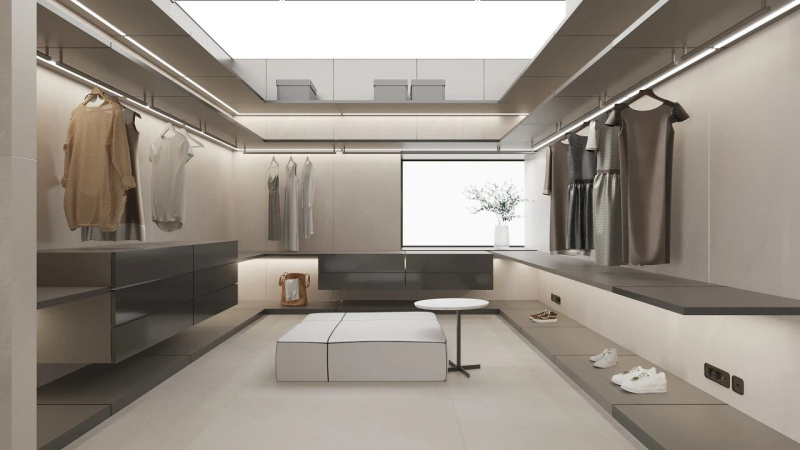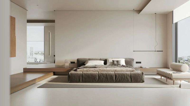 卧室、衣帽间、主卫有序布局,满足屋主多功能兼容需求,米白色调让空间更加通透明亮。墙地一体视觉扩容,米白色调提升空间洁净感。