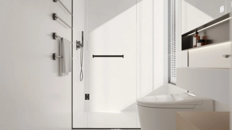 卫生间墙地一体,铺贴冠珠肌肤釉白玉兰-米白,奶白色调为空间注入一份洁净感与宁静温润的质感。